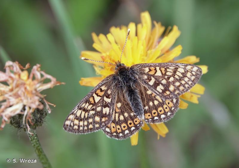 Le Damier de la Succise est un petit papillon de jour caractérisé par la présence d'une ligne discrète de points noirs au bout de ses ailes postérieures. Il tire son nom d'une de ses plantes hôtes : la Succise des prés, qui est aussi la plante préférée de ses chenilles en plaine. En montagne, ses chenilles se nourissent de gentianes ! Il apprécie particulièrement les tourbières, et plus largement les alpages et prairies de montagnes.